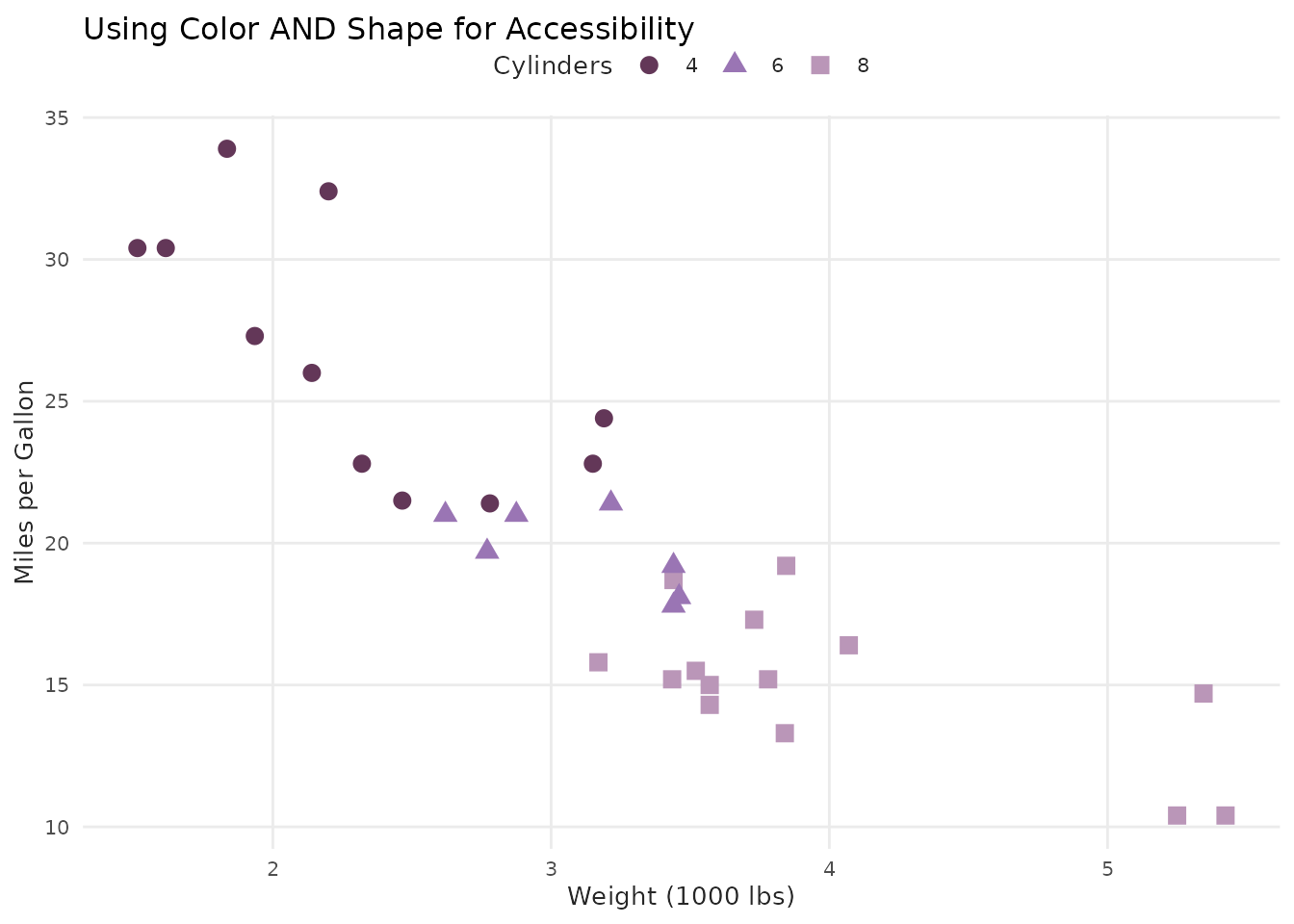 scale_shape_manual(values = c(16, 17, 15), name = "Cylinders") +