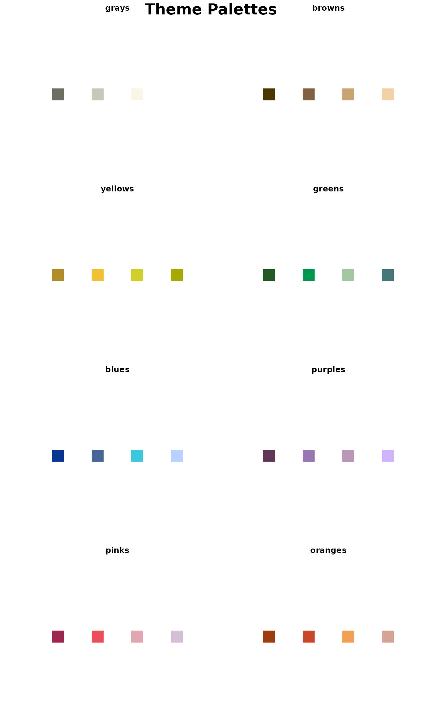 show_palette_grid(c("grays", "browns", "yellows", "greens", "blues", "purples", "pinks", "oranges"), "Theme Palettes")