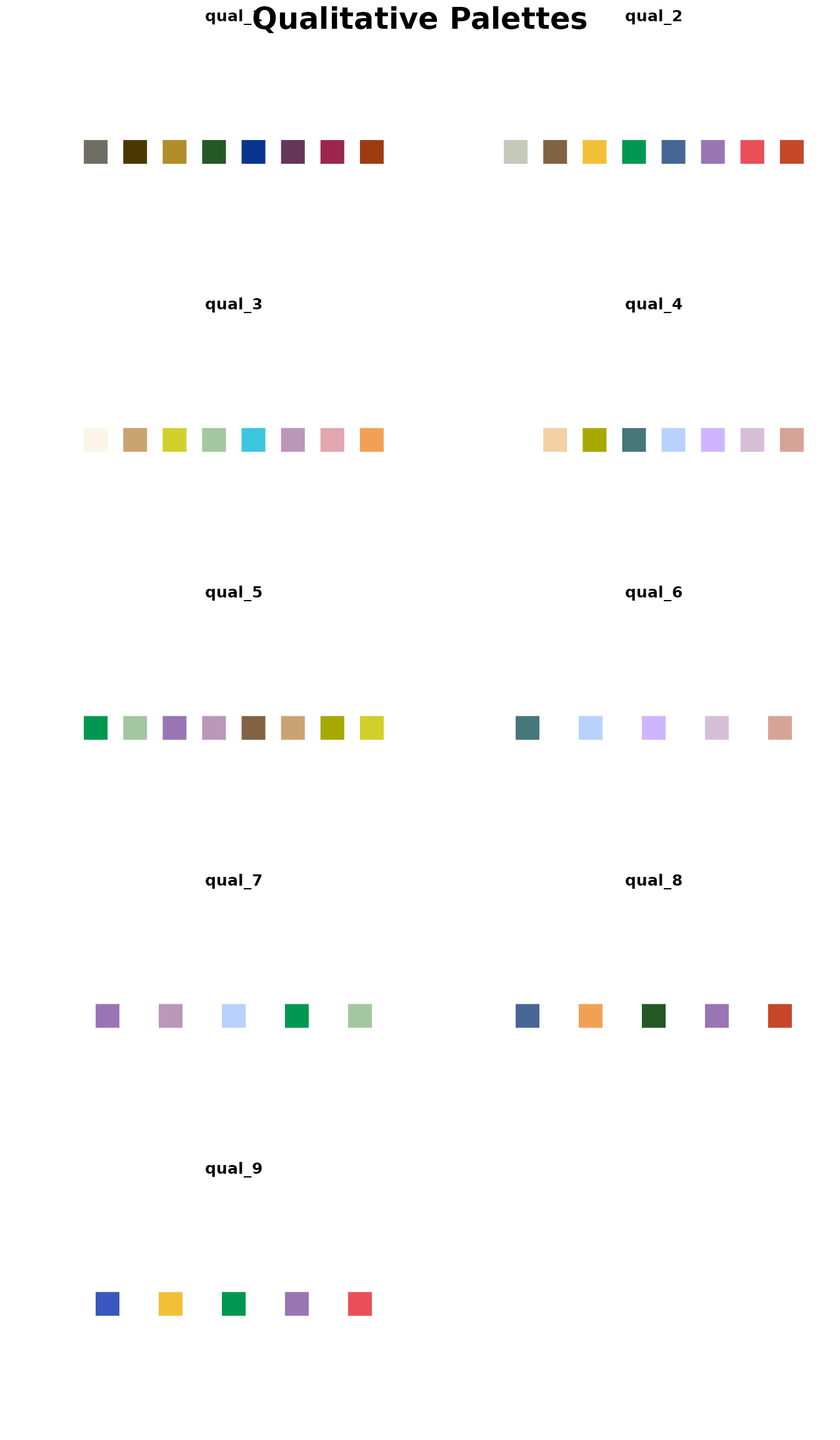 show_palette_grid(paste0("qual_", 1:9), "Qualitative Palettes")