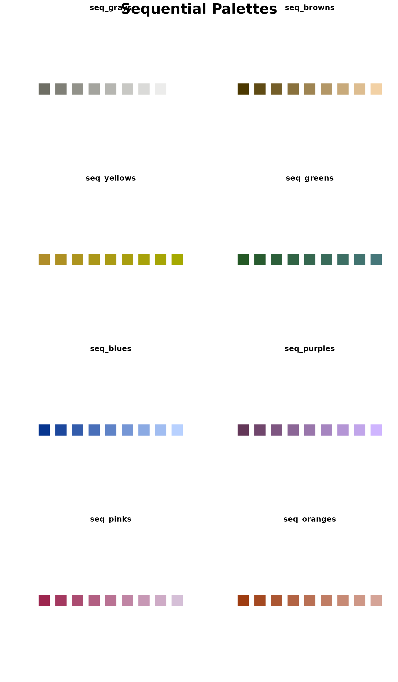 show_palette_grid(c("seq_grays", "seq_browns", "seq_yellows", "seq_greens", "seq_blues", "seq_purples", "seq_pinks", "seq_oranges"), "Sequential Palettes")
