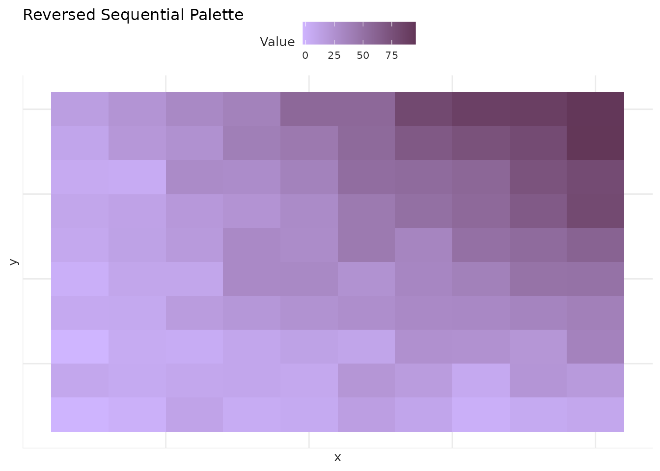 - Sequential Palettes (9 colors): Continuous/ordered data