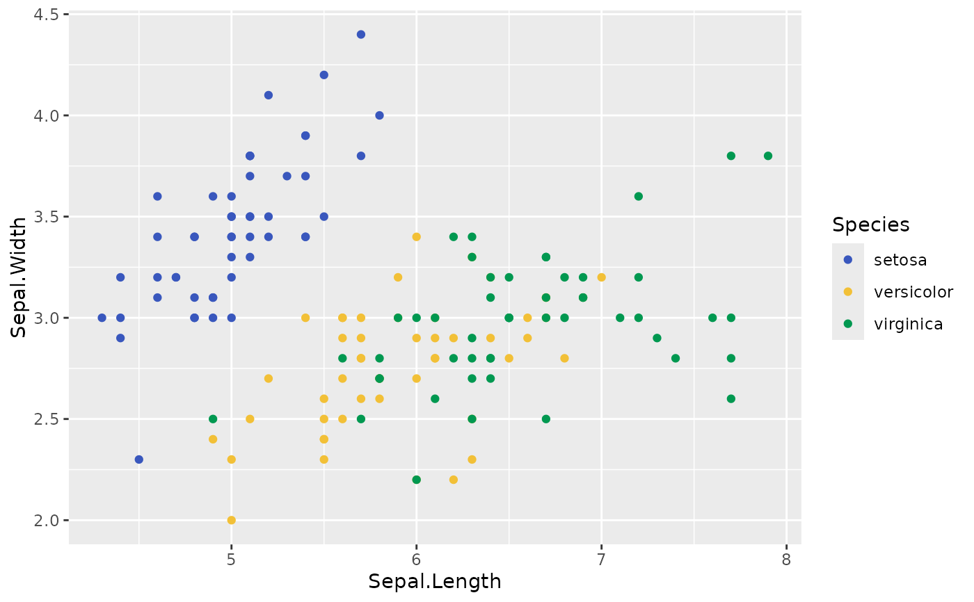 ggplot(iris, aes(x = Sepal.Length, y = Sepal.Width, colour = Species)) +