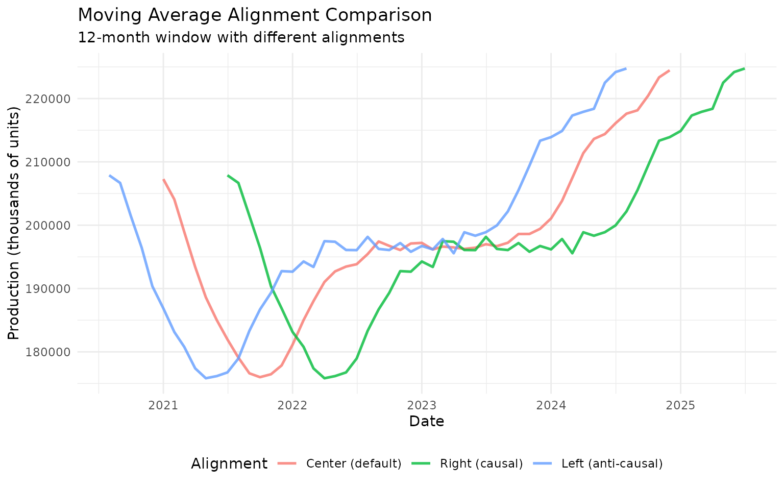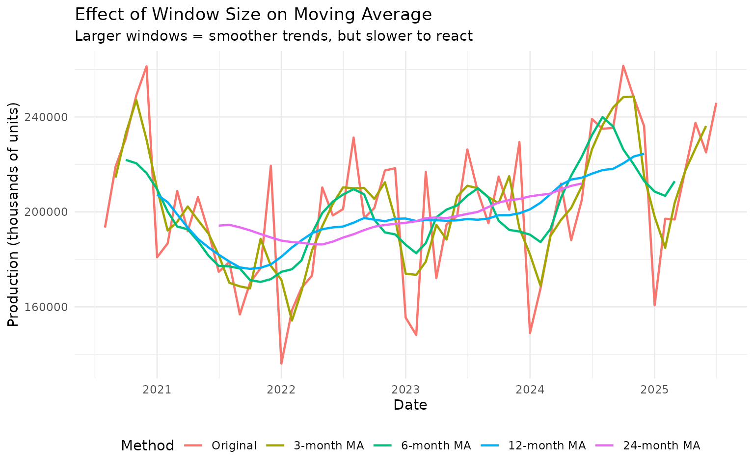 - Medium windows (12): Balance between smoothness and responsiveness (one year for monthly data)
