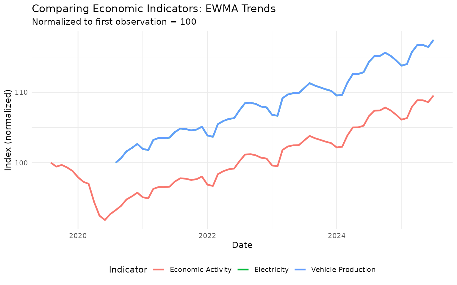 title = "Comparing Economic Indicators: EWMA Trends",