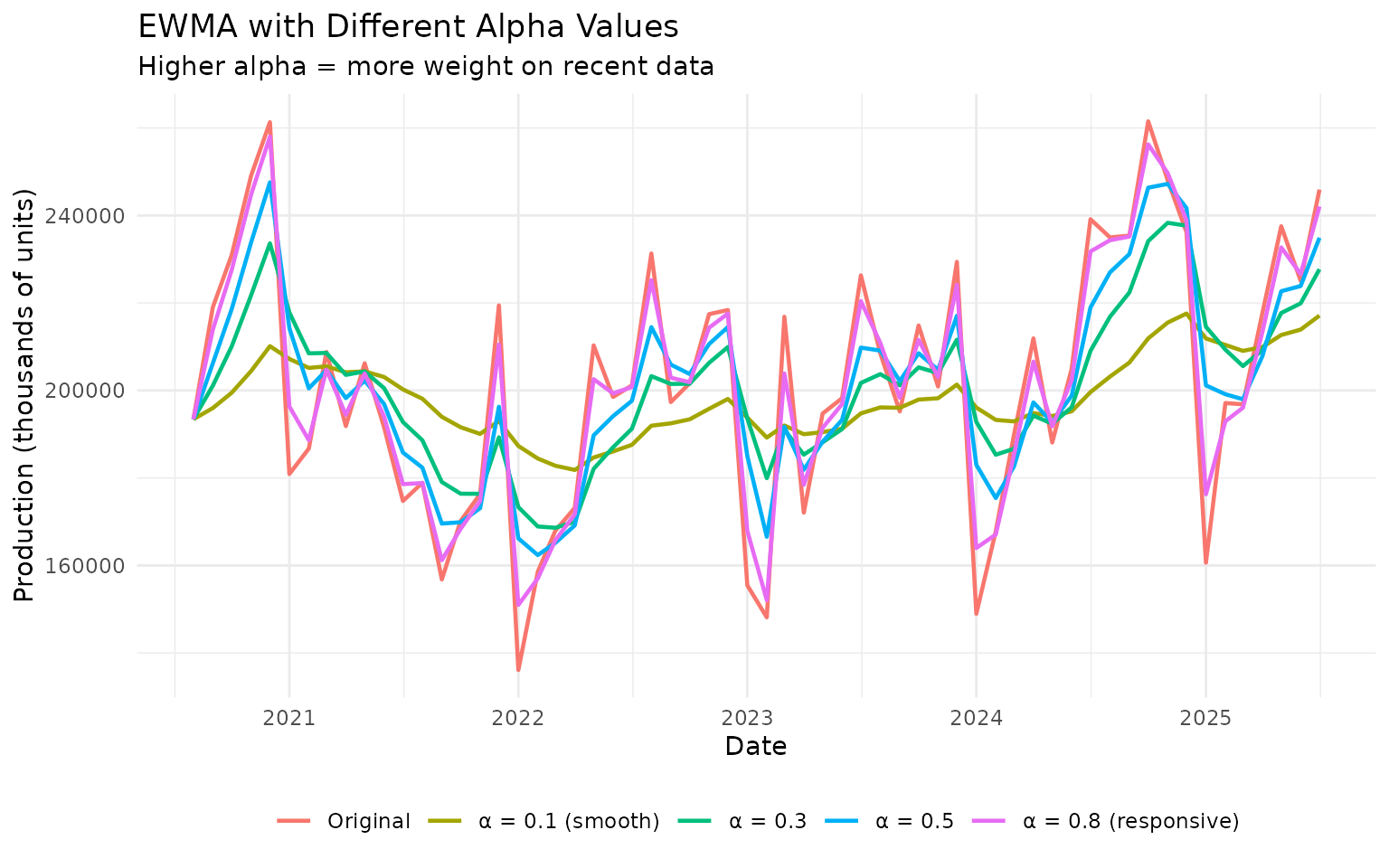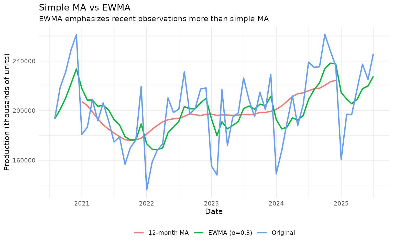 Key parameters: - Window size (for MA): 12 months typical for monthly data - Alpha (for EWMA): 0.2-0.4 for most applications